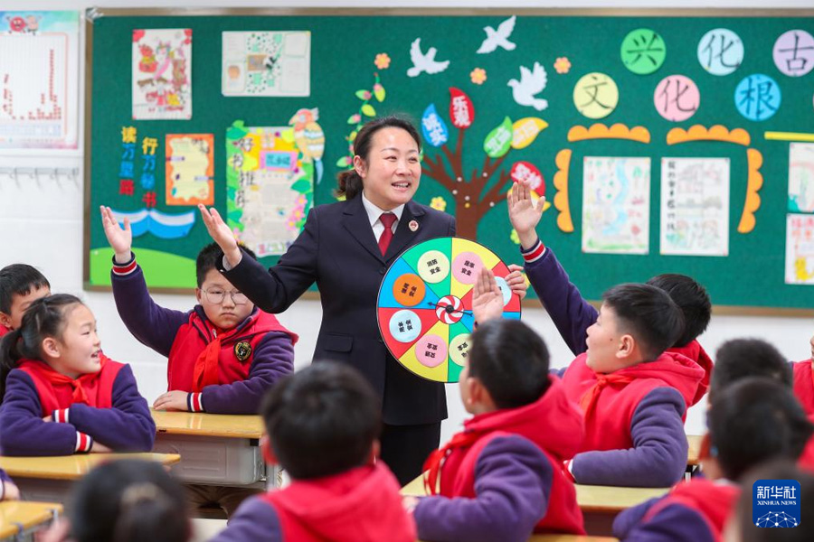4月2日,講解員在河南省平頂山市寶豐革命紀念館為學生講述抗戰歷史。(新華社發 何五昌/攝)