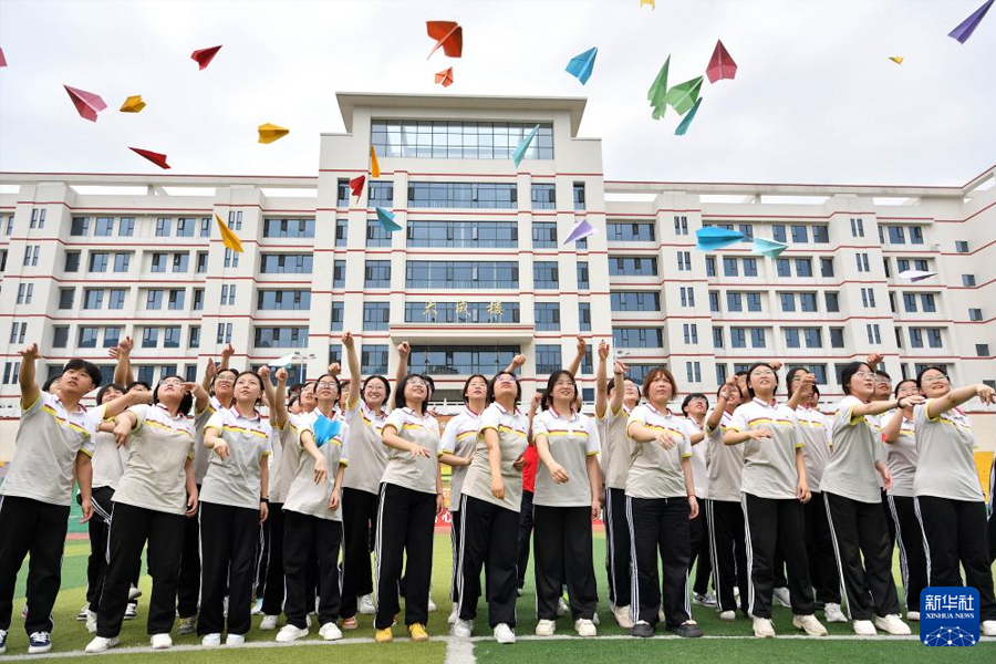 6月3日,在湖北省襄陽市保康縣第一中學,高三學生在操場上放飛寫有自己心愿的紙飛機。(新華社發 楊韜/攝)