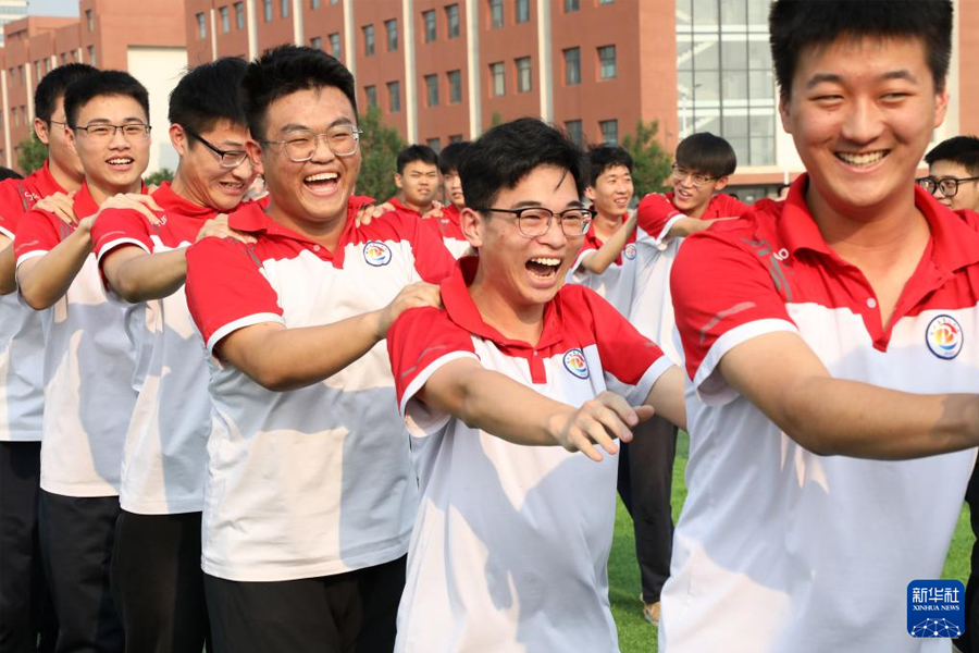 5月28日,在山東省濱州市博興縣第三中學,高三學生在操場上做減壓游戲。(新華社發 陳彬/攝)