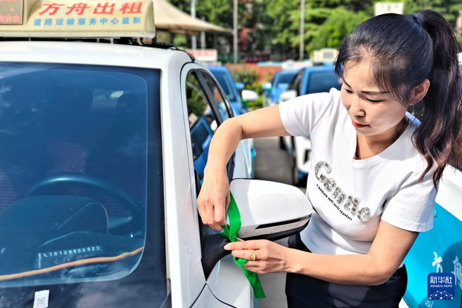 6月4日,河南省三門峽市啟動“任你乘風破浪,保你追逐夢想”愛心送考公益活動。一名“愛心送考”車隊的女司機將象征“平安、快捷”的綠色絲帶系在車上。(新華社發 杜杰/攝)