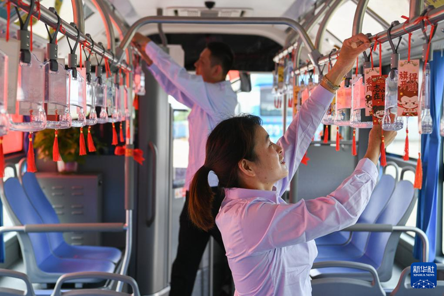 6月5日,在浙江省金華市交投公交集團客運金西公司,工作人員在高考送考公交車廂里掛祝福卡片。(新華社發 時寬兵/攝)