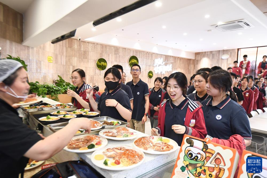 6月5日,學生在南京市第九中學食堂選購營養餐。近日,江蘇省南京市的不少中學食堂紛紛推出為考生特別定制的愛心營養餐。(新華社發 楊素平/攝)