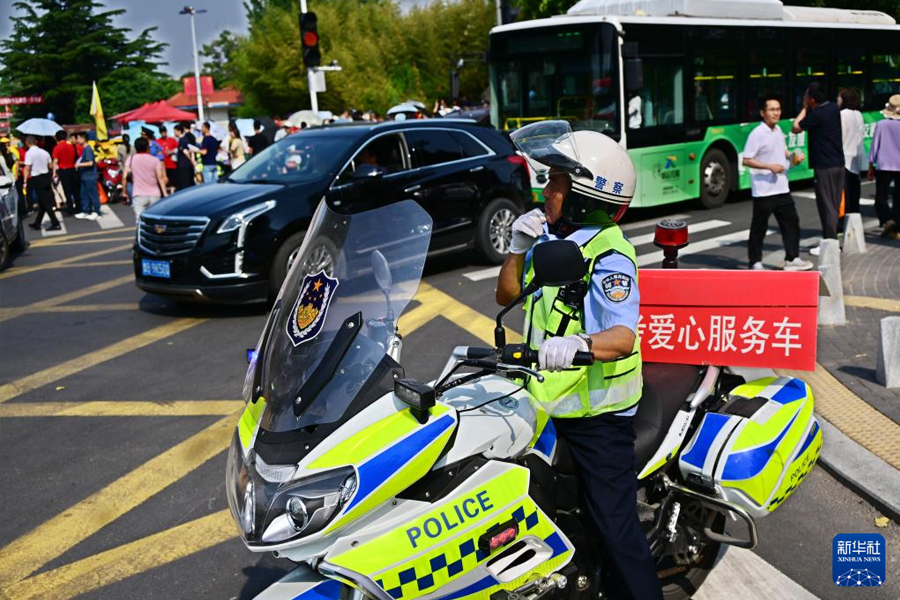 6月7日,在南京市建鄴區中華中學考點外,南京交警四大隊的交通警察在指揮交通。(新華社記者 李博/攝)
